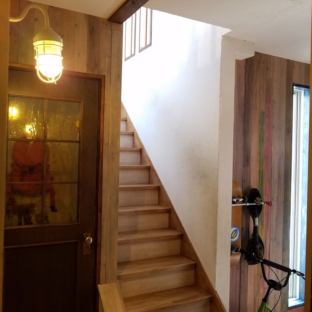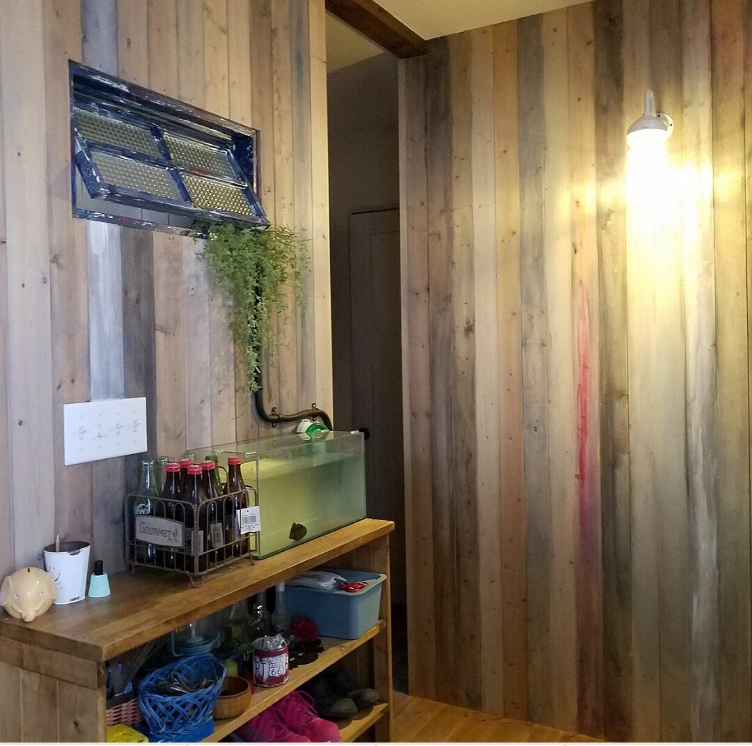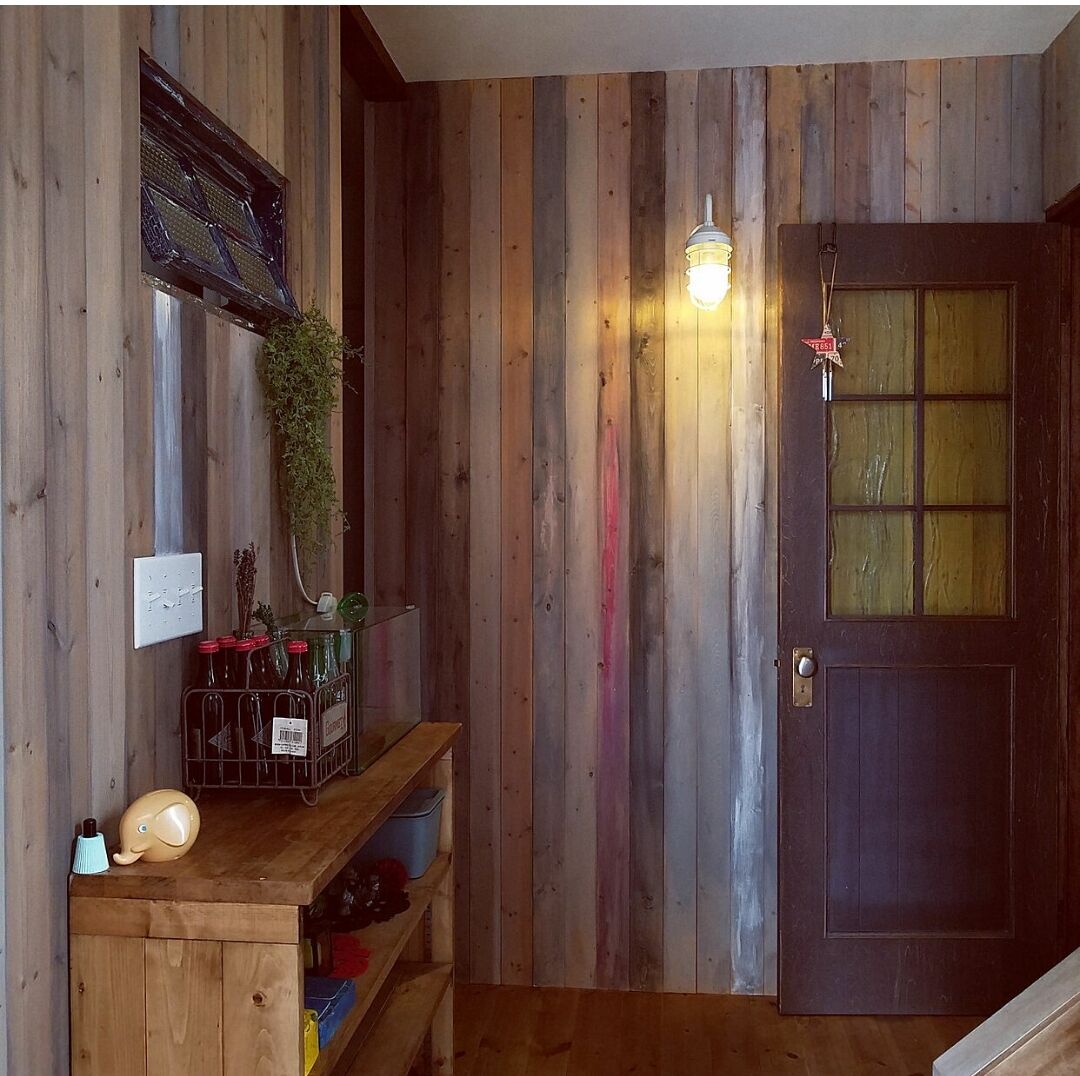 水で薄めたグレーのペンキでSPF材の板壁の玄関に塗っていきました。
