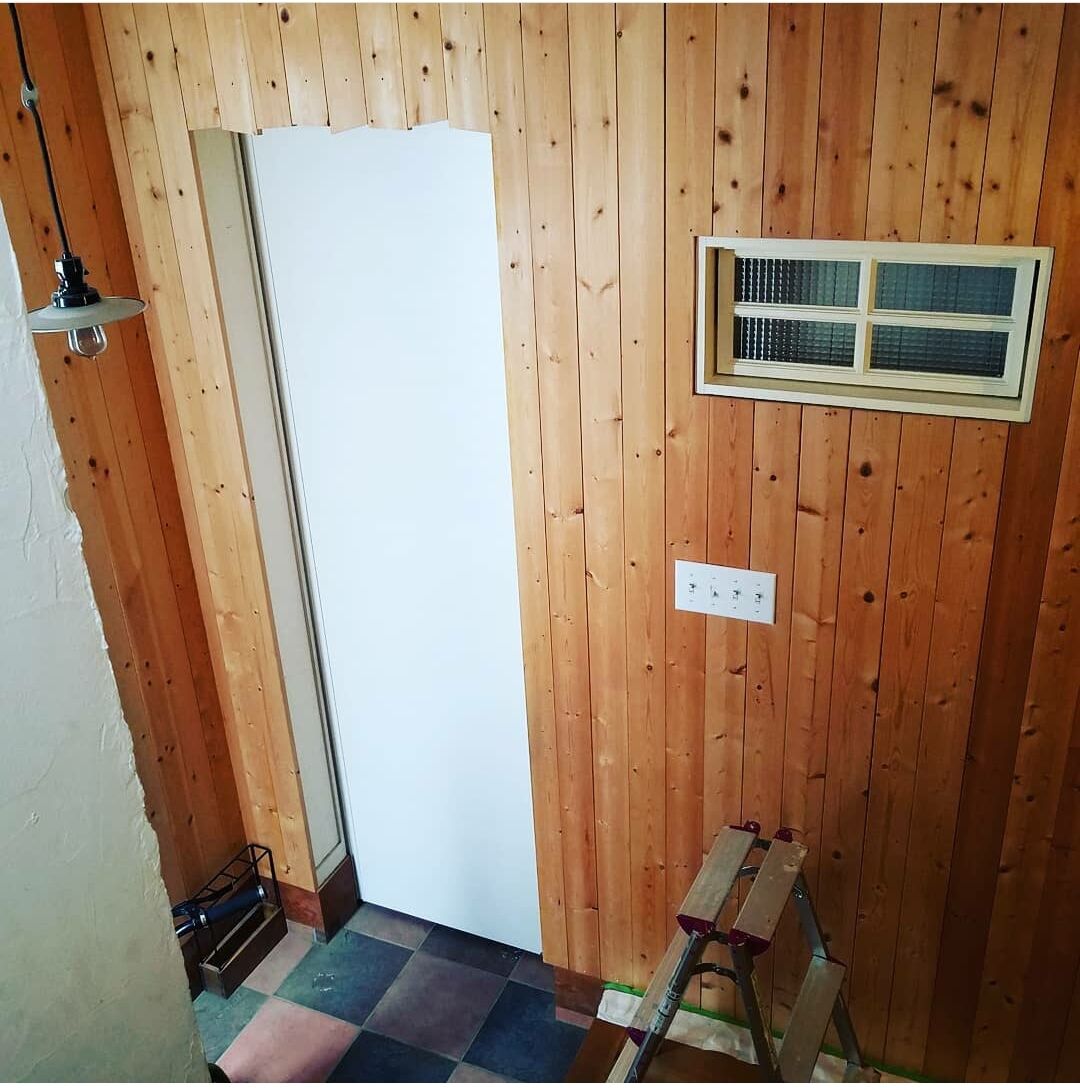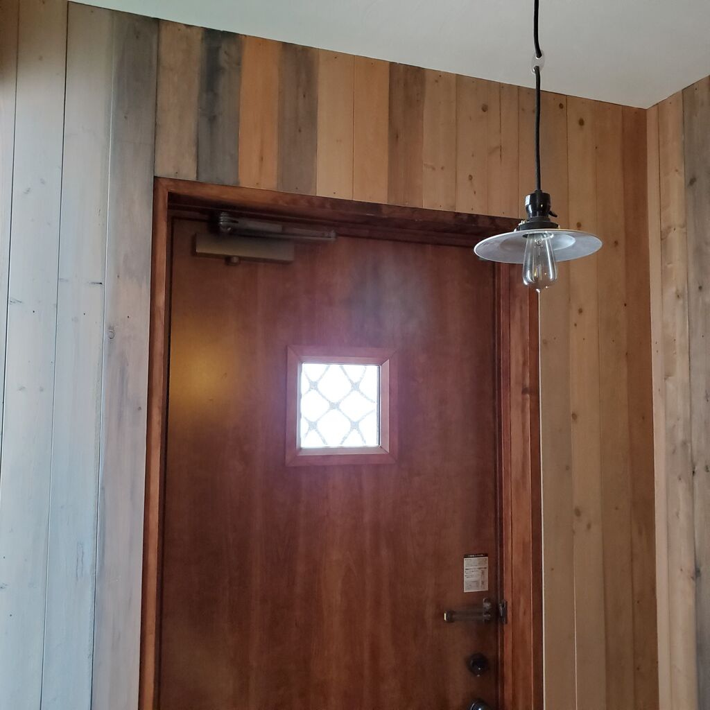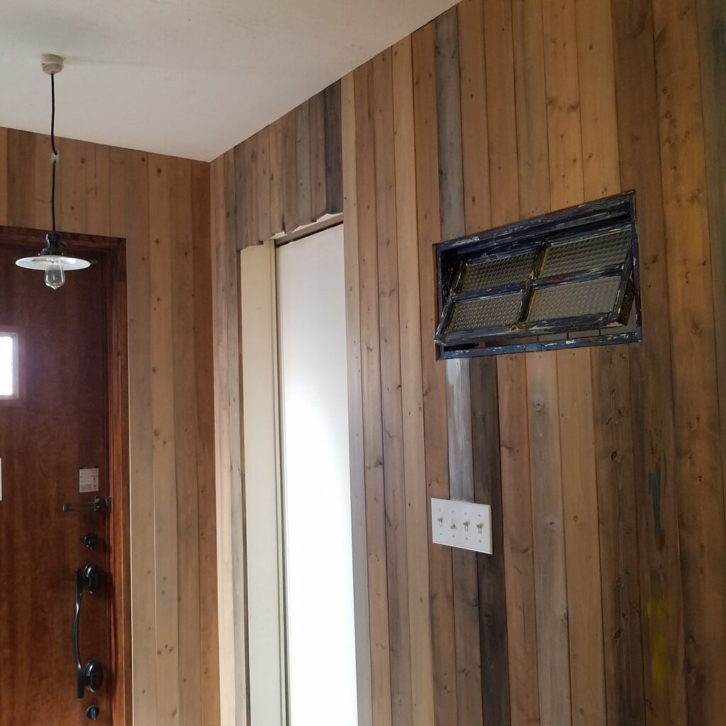 水で薄めたグレーのペンキでSPF材の板壁の玄関に塗っていきました。
